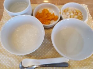 【中期】☆5倍粥☆白菜と人参の澄まし汁☆鱈の煮魚☆蒸かし南瓜☆キャベツのおかか和え