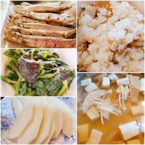 ☆新ごぼうの炊き込みご飯☆焼きししゃも☆ほうれん草海苔和え☆えのきと大根の澄まし汁☆王林