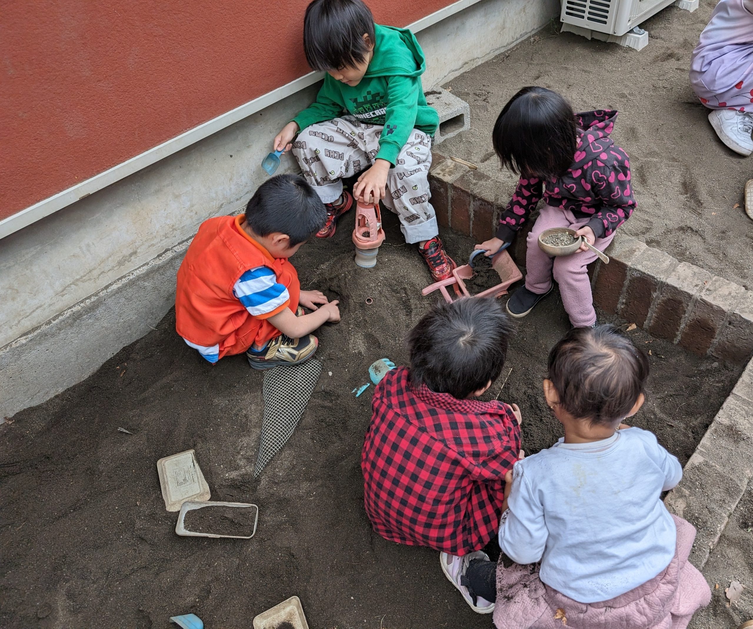 午前中からどんよりとした雲がかかっていましたが雨が降ってきたらすぐにお部屋に戻れるように・・・と子ども達と相談しお庭で遊びました♪大きなお山を作ったり・・・