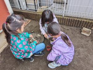 雨上がりの湿った土を集めて楽しんでいました♪明日は晴れるかなぁ~?
