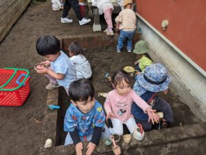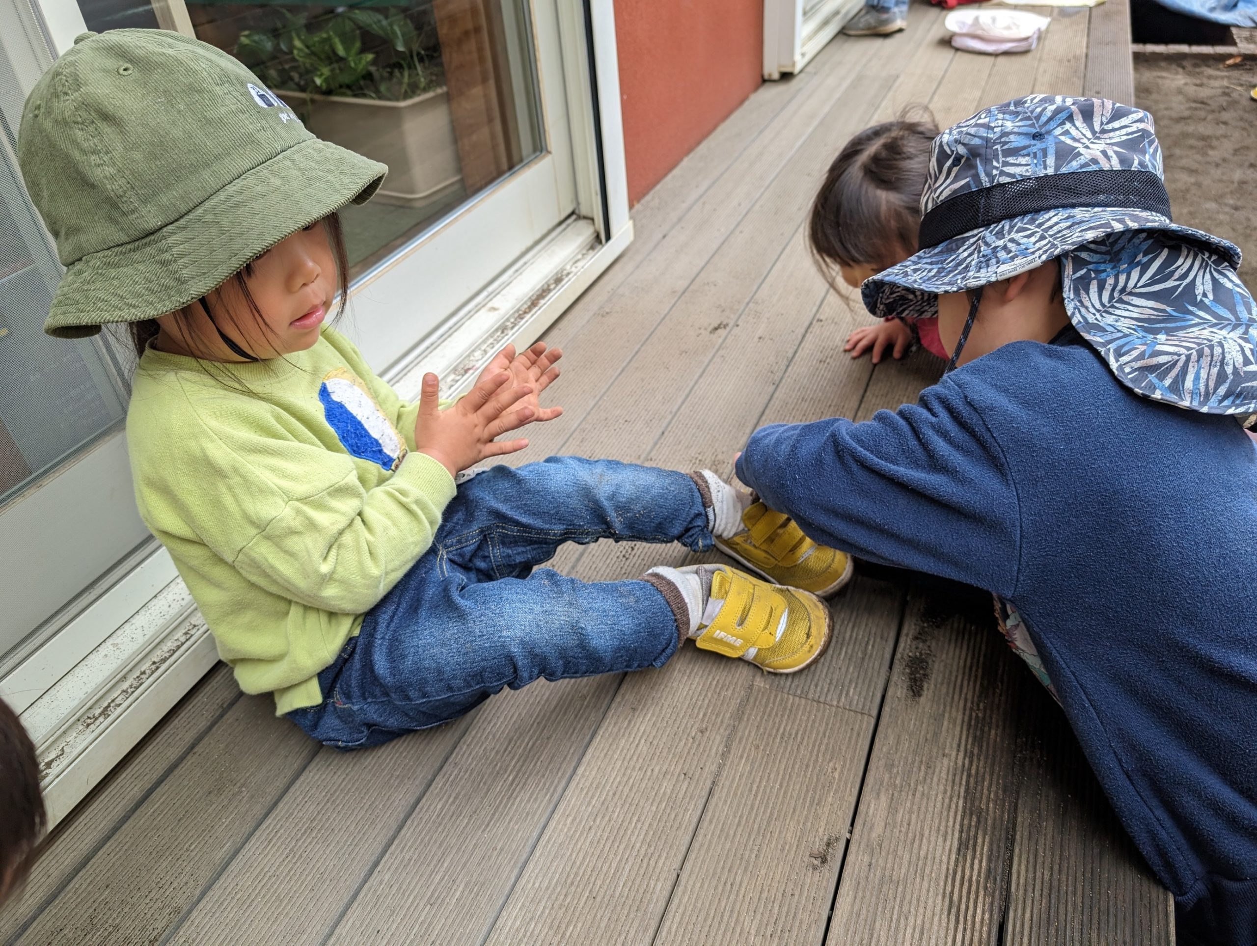 今日はどんよりとした天気でしたが晴れている間にお庭で遊びました!!靴が脱げてしまった女の子に優しく靴を履かせてあげていたお兄ちゃんです😊