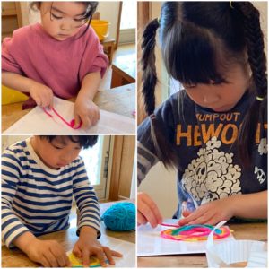 今日は毛糸を使った造形の中で〝ハサミを使う〟〝手をうまく動かす〟〝物に張り付ける〟事を学びました。