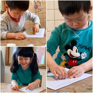 薄いテープを剥がすには指先の動きと調節が必要で、時には台紙ごと剥がしてしまったりと苦戦しながら両面テープと向き合ってた子どもたちですが、台紙ごと剝がれてしまった時には何か違うかな?と気づき、『こうなっちゃったんだけど、どうすればいい?』と、疑問に感じた事を、自分から安藤先生に聞くことができていました。