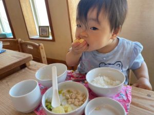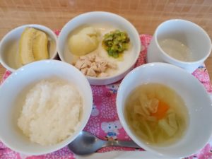【後期】☆5倍粥☆野菜スープ☆鶏肉のやわらか煮☆じゃが芋スティック☆レタスおかか和え☆バナナ