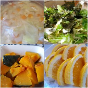 ☆彩りスープ☆水菜のサラダ☆蒸かし南瓜☆オレンジ