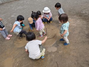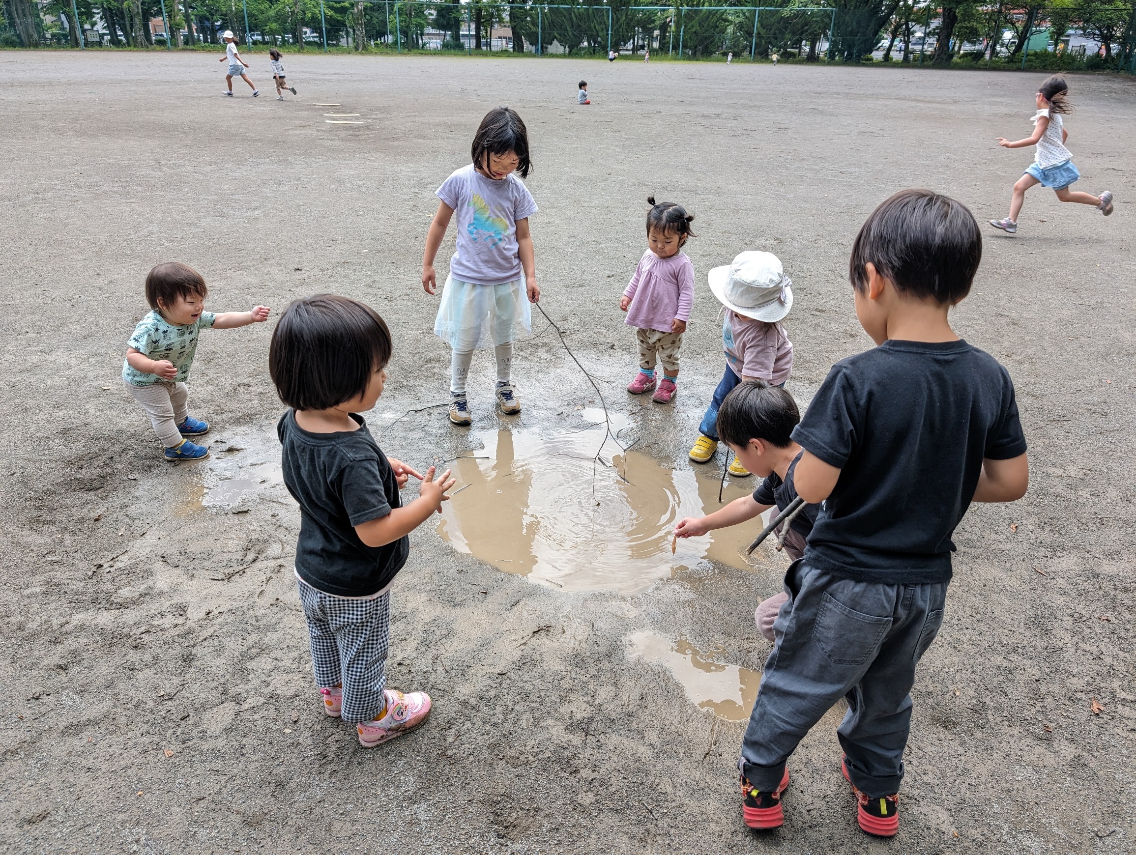 今日はグラウンドに行きました♪雨上がりのグラウンドで大きな水たまりを発見した子ども達・・・!!大胆に入ってみたり・・・、ちょっと離れた所で様子をみたり・・・と楽しんでいた子ども達です😊