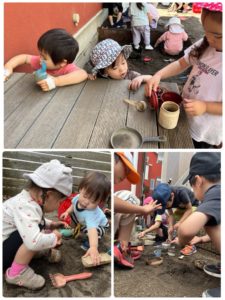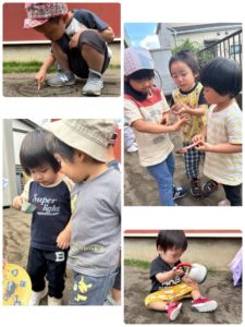 見つけた虫を友だち同士見せ合ったり、お絵描きを楽しんだり…