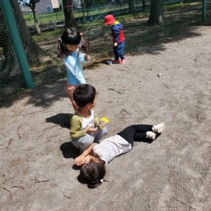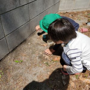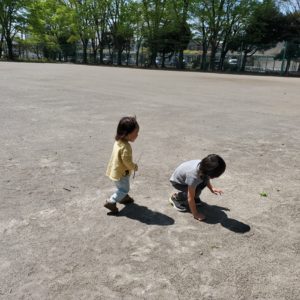 今日は近くのグランドにお散歩に出かけました。珍しく誰も使っていなかったので、わぁーっと走り出すかと思いきや、何故か子ども達はみんな端っこに…小さな小さな虫探しに夢中になっている子、木陰でお絵描きを楽しんでいる子、砂遊びを楽しんでいる子、それぞれの遊びに夢中になっていました。ちょっと拍子抜けした大人たちです(^^;) そうは言ってもこの広いグランドなので、そうち追いかけっこが始まり、元気いっぱい気持ちよさそうに走り回っていました!