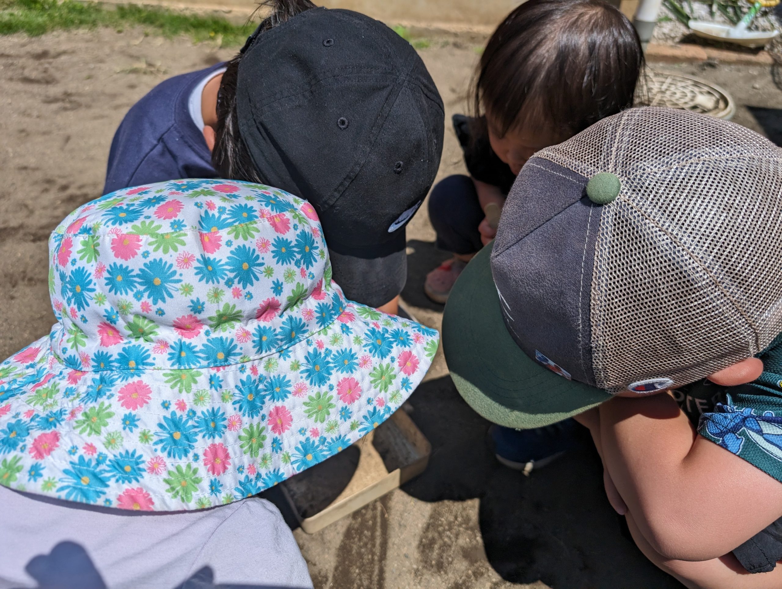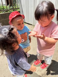 今日もお庭で虫探しに夢中の子ども達♪年長の男の子はダンゴムシを見ながら「これはメスで・・これはオスだよ」とみんなに教えてあげていました😊