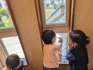 大きい子達が畑の手入れをしている様子を「何してるんだろ~」と興味津々で窓から覗いていた小さい子達です😊