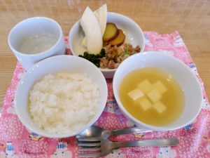 【完了期】☆軟飯☆豆腐の味噌汁☆ピーマンと豚肉の生姜焼き☆さつま芋の煮物☆小松菜のお浸し☆バナナ