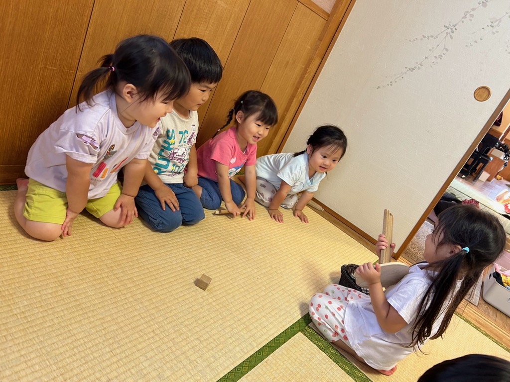 大きい子達がお掃除をしてくれている間、別のお部屋で待っている小さい子達。「おはようございます!今日は何日かな~?」と、朝の集いごっこが始まりました🤭日常の中の様々な場面がごっこ遊びの中に垣間見えます!