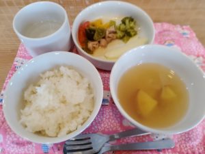 ☆軟飯☆さつま芋の味噌汁☆鶏肉とパプリカの甘酢炒め☆小魚☆茹でブロッコリー☆りんご