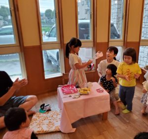 チャレンジクイズで楽しんだり、リクエストのゼリーケーキでお祝いをしました♪最後はお友達からお花のプレゼント♪