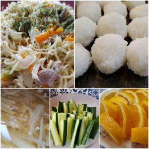 ☆塩焼きそば☆ころころおにぎり☆大根の澄まし汁☆胡瓜スティック☆オレンジ