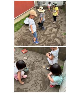 車が走った跡が道路のようになっていてそれもまた面白い発見ですね✨女の子達はお絵描きを楽しんでいました😊