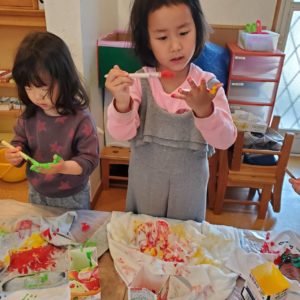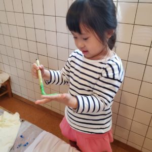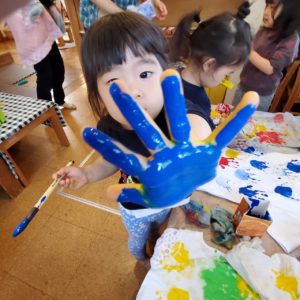 指先を上手く使って手に塗り広げ、綺麗に手形を付けられるとニコッと😊嬉しそうな笑顔を見せてくれました。