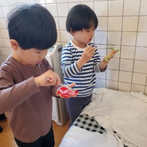 小さいこが先にやってると大きいこも待ちきれず「早くやりたいな~」とTシャツ片手につぶやいていました。
