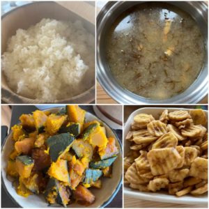 ☆白米☆もずくの味噌汁☆南瓜の煮物☆バナナチップ