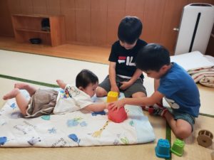 👇0歳児のお友だちと遊ぶのが好きなお兄ちゃん達。「どっちに入ってるでしょう~か⁈」と、小さなおもちゃをカップに隠し、お友だちがカップをポカポカ叩く姿を愛おしそうに笑って見ているのでした🤗