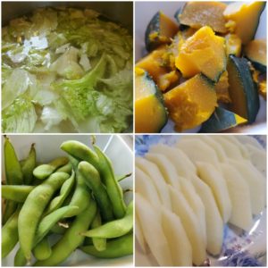 ☆ビビンバ丼☆レタスとコーンのスープ☆蒸かし南瓜☆枝豆☆王林