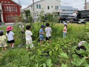 とうもろこしの実が出来てきている様子に気付き嬉しそうな子ども達。匂いをかいでみて「とうもろこしの匂いだ!」と確認してました😊