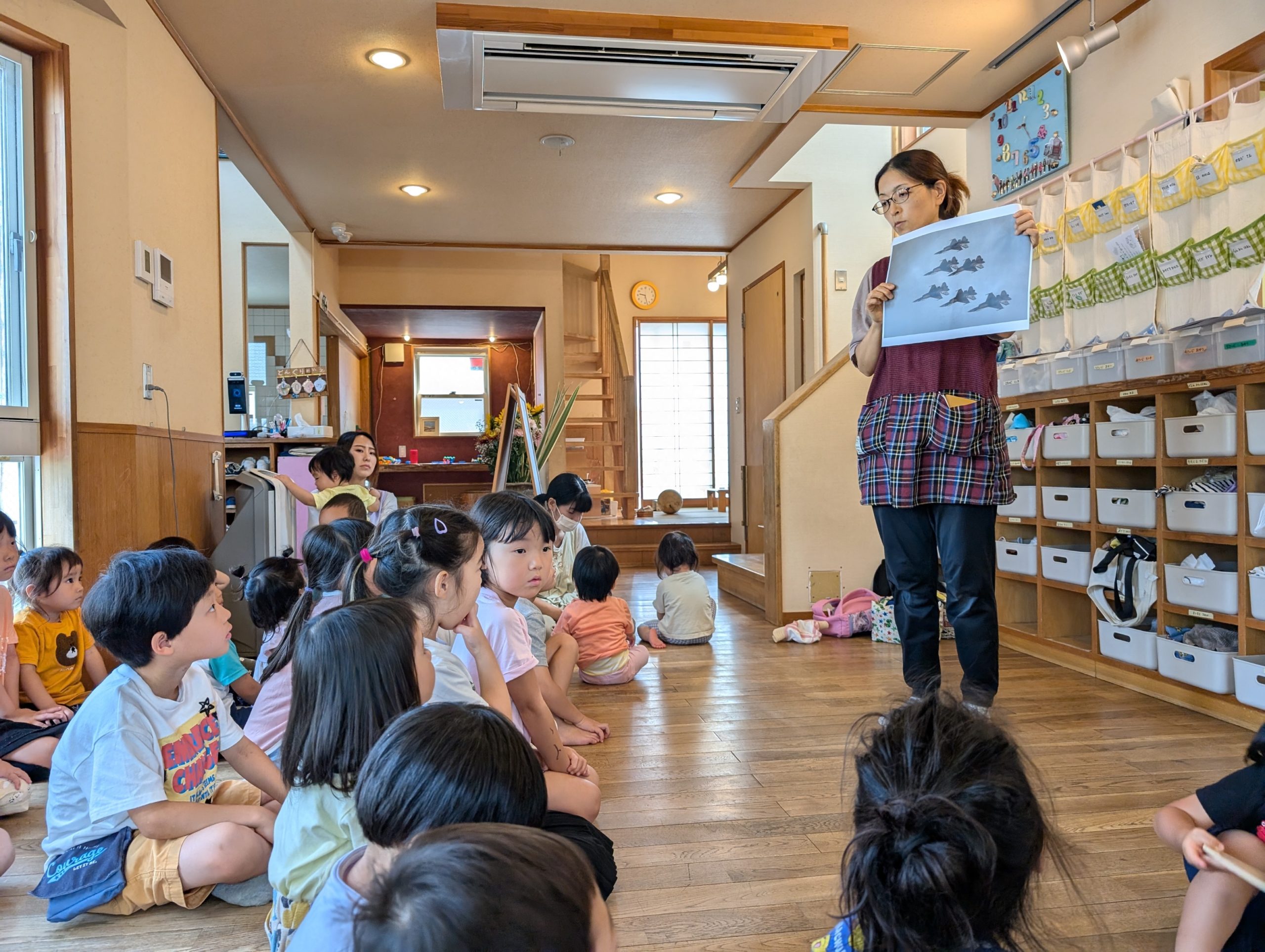 今日8月6日は79年前に広島に原爆が投下された日。子ども達に実際に日本で起こった事や今現在も世界では悲しい思いをしている人がいる事を伝え、みんなで戦争について考え合いました。