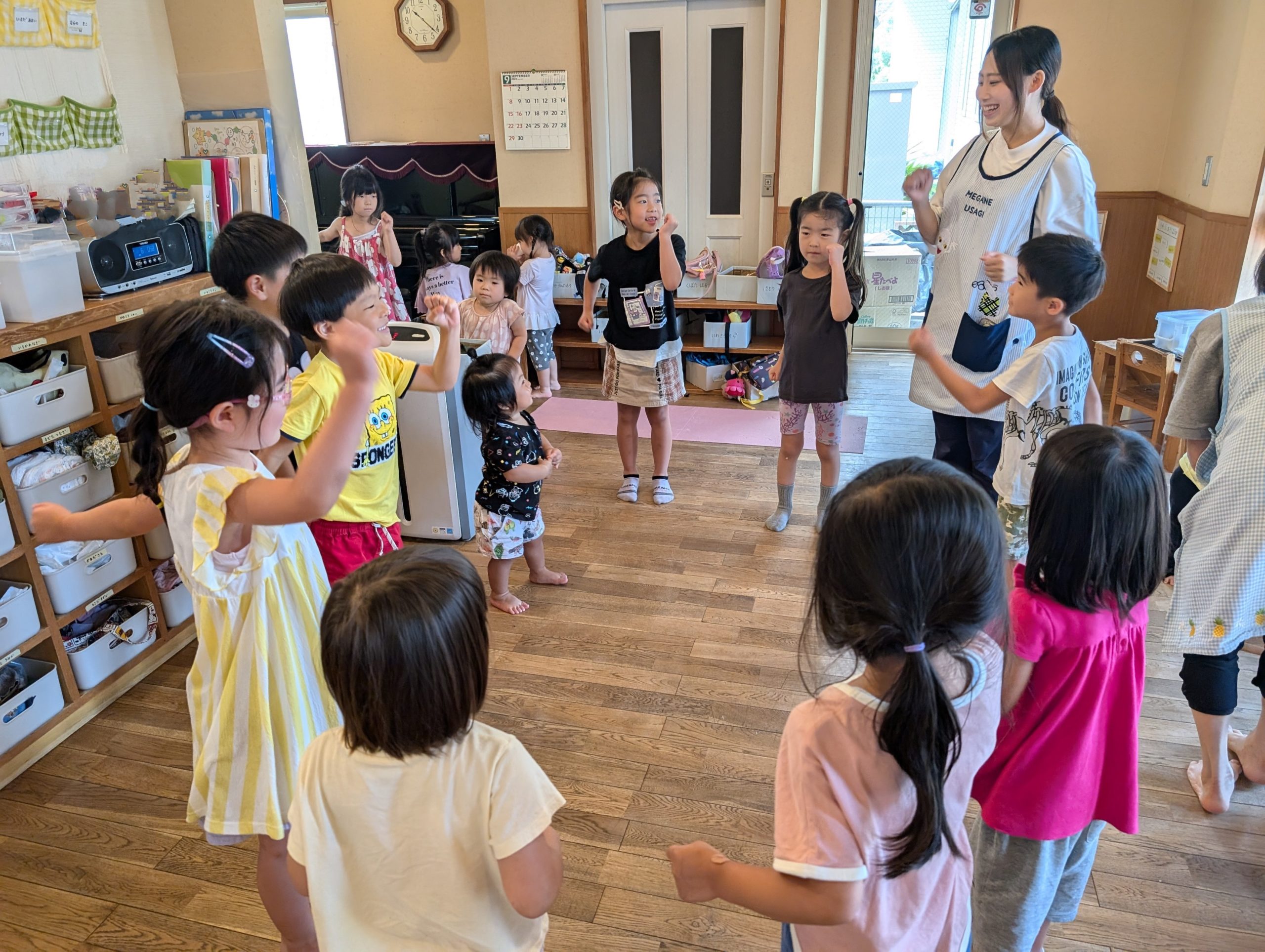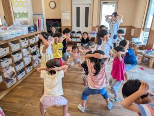 みんなでスクワットをしていると大きい子達や小さい子達も集まってきました♬最後はみんなでスクワットに挑戦しました!!