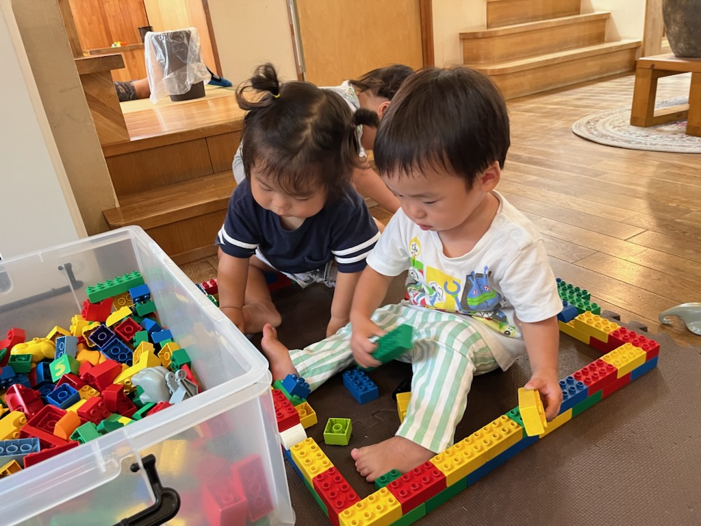ブロックで大好きな新幹線を作ってみせてくれたのは3歳児の男の子。新幹線に乗って旅してみたいね(^_-)-☆