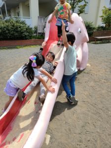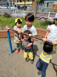 大きい子ども達が中心となって小さい子ども達と一緒に遊びを広げてくれていてとっても楽しそうでいい雰囲気でした♪そして、自然に大きい子ども達が小さい子ども達のお手伝いをしてくれていました。そんな憧れのお兄ちゃん達の姿をよーく見て小さい子ども達も育っていくのです(^^♪