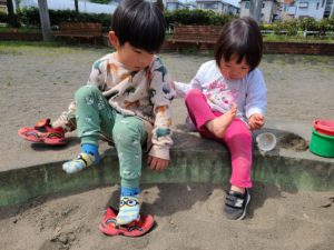 砂場では靴に入ってしまった砂が気になった様子の2人…自分達で気づきパンパン!!と足をはらっていました😊