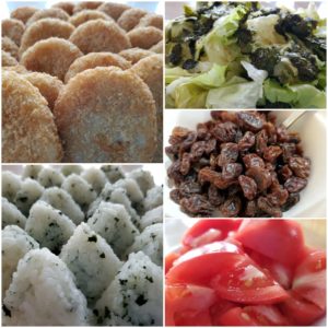 ☆コロッケ☆わかめおにぎり☆レタスのりサラダ☆トマト☆レーズン☆野菜ジュース