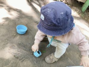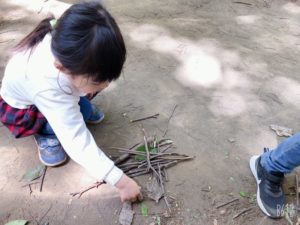 【大きいこたちは落ちていた枝を置き、同じぐらいの長さの枝を箸に見立てたり、木の皮部分を肉として見立てBBQをして楽しんでいました。発想が面白く自然を使った遊びでした。】