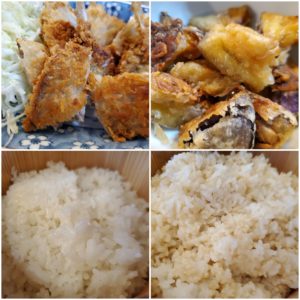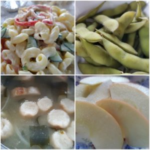 ☆魚フライ(鯵、白身魚)☆千切キャベツ☆茄子の唐揚げ☆玄米入りご飯/白米☆マカロニサラダ☆枝豆☆玉葱とお麩の味噌汁☆りんご