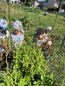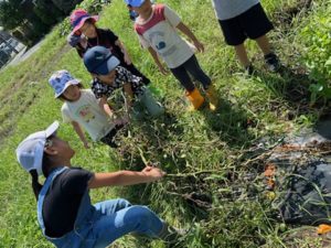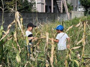 4.5歳児の子ども達は畑に出てミニトマトやキュウリ、とうもろこしなどの夏野菜の片付けを始めました。この夏は特に暑さが厳しかったり激しい雷雨や台風もやって来ました。そんな厳しい気象状況を乗り越えて実った夏野菜のたくましさを、土の中に張った根っこから感じていた子ども達でした!