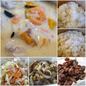 ☆南瓜と鶏肉のシチュー☆玄米入りご飯/白米☆人参とほうれん草のツナ和え☆レンコンときのこソテー☆レーズン
