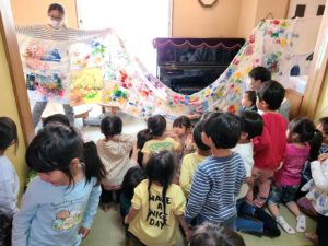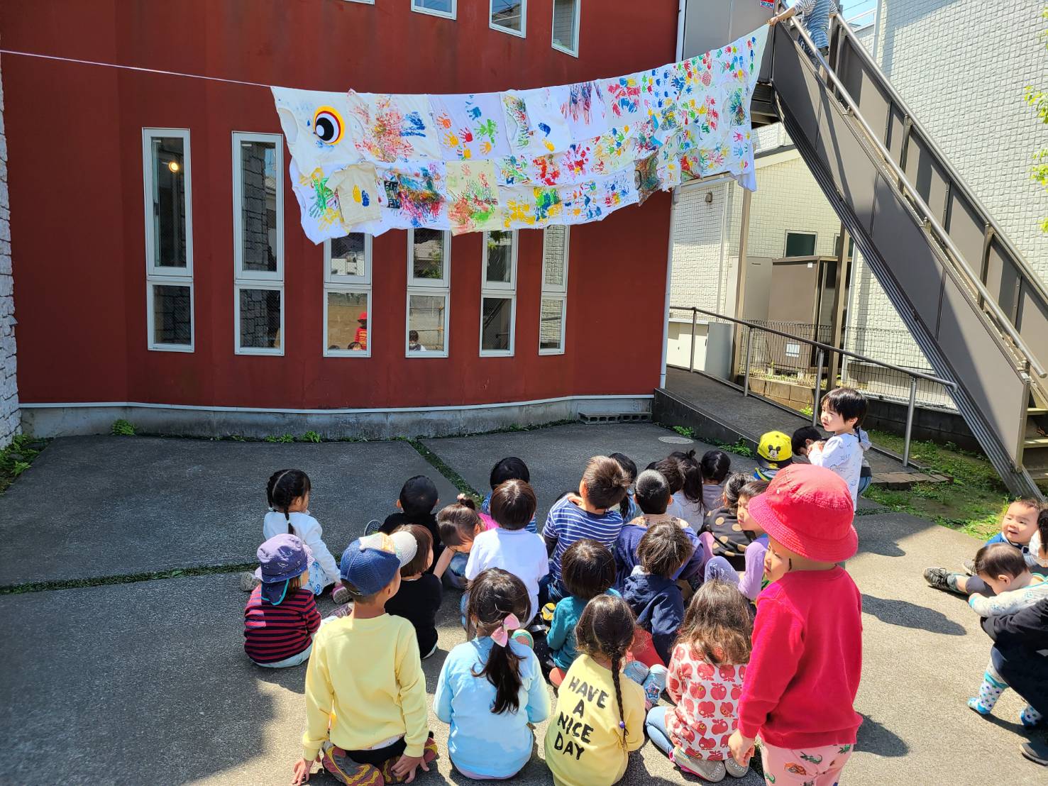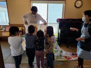 『元気に大きくなるぞ』『コロナが早く終わるように』と、それぞれが思いを込めて手形ペイントをしたTシャツを一つに縫い合わせ、大きなこいのぼりを作りました。みんなの想いがこ~んなに大きくなって一つに繋がったよ!でも…何か足りない…「目だ!」ということで年長さんに最後の仕上げをしてもらいました。これでしっかり前を向いて歩んで行けます!