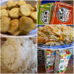 ☆ご飯(ふりかけ)☆チキンナゲット☆野菜炒め☆野菜ジュース☆カップゼリー