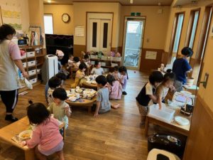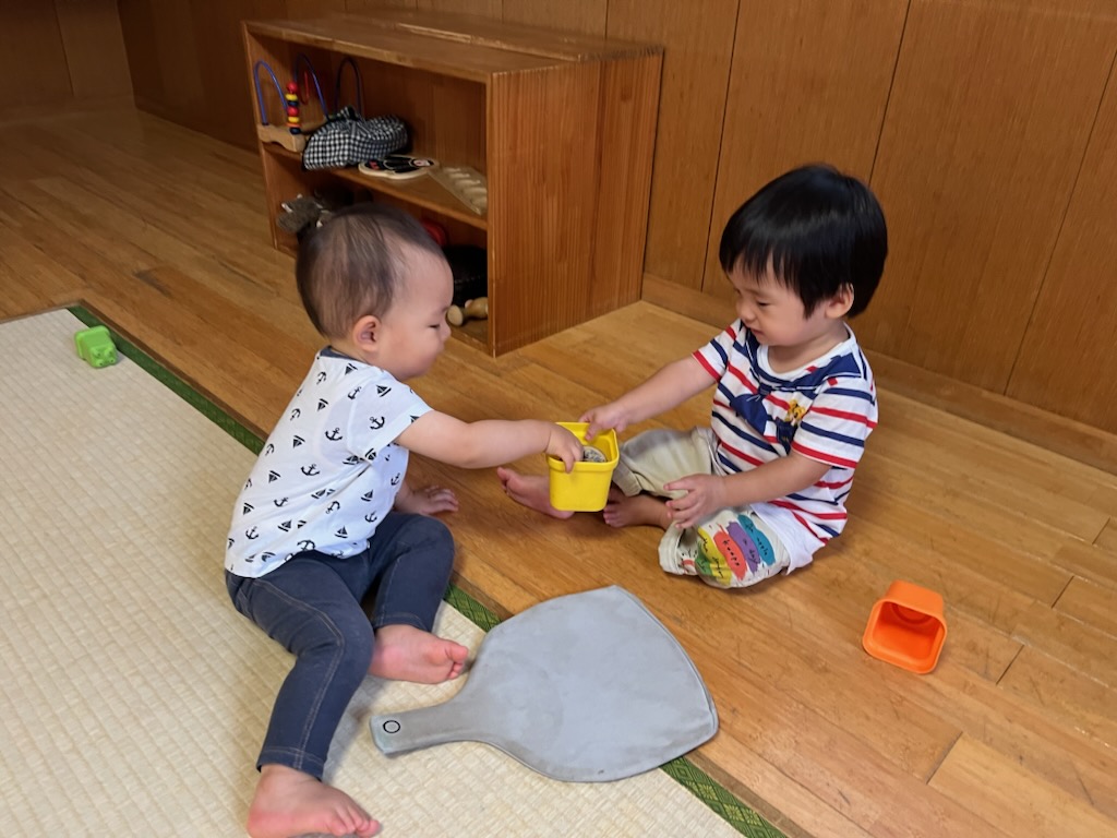 1歳児の2人は仲良く遊んだりお互い負けじと張り合ってみたりしながら、色んな表情を見せていました。他にも大きい子の真似っこをして遊ぶ小さい子達や小さい子も大きい子も一緒に遊ぶ様子などが見られました♪