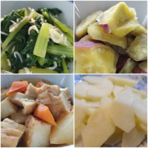 ☆小松菜としらすの和え物☆蒸かしさつま芋☆厚揚げの煮物☆王林