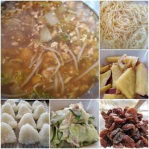 ☆白菜と挽肉のあんかけラーメン☆塩おにぎり☆さつま芋のレモン煮☆キャベツのツナ和え☆レーズン