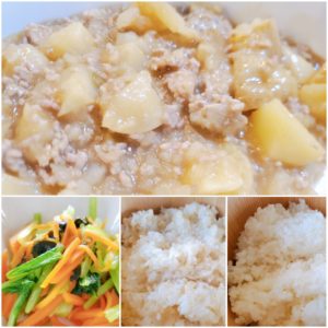 ☆じゃが芋のそぼろ煮☆玄米入りご飯/白米☆小松菜人参の海苔和え