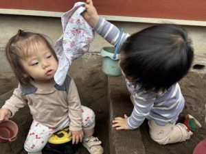 「落ちてるよ~」というように帽子を拾ってあげていた女の子♪お庭での0歳児の2人のやり取りです😊