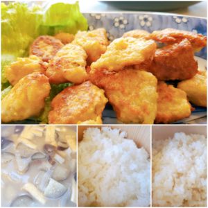 ☆鶏挽き肉と蓮根のふわふわ揚げ☆玄米入りご飯/白米☆茄子と油揚げの味噌汁☆レタスのりサラダ☆小魚☆レーズン