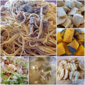 ☆トマトと豚肉のパスタ☆手作りパン☆レタスツナサラダ☆蒸かし南瓜☆きのこのスープ☆バナナチップ