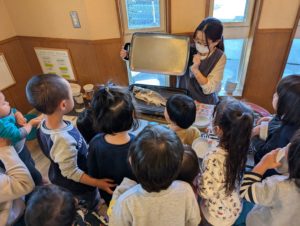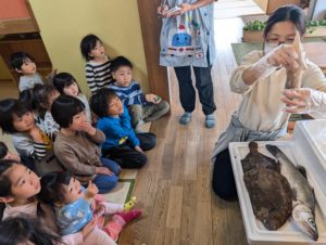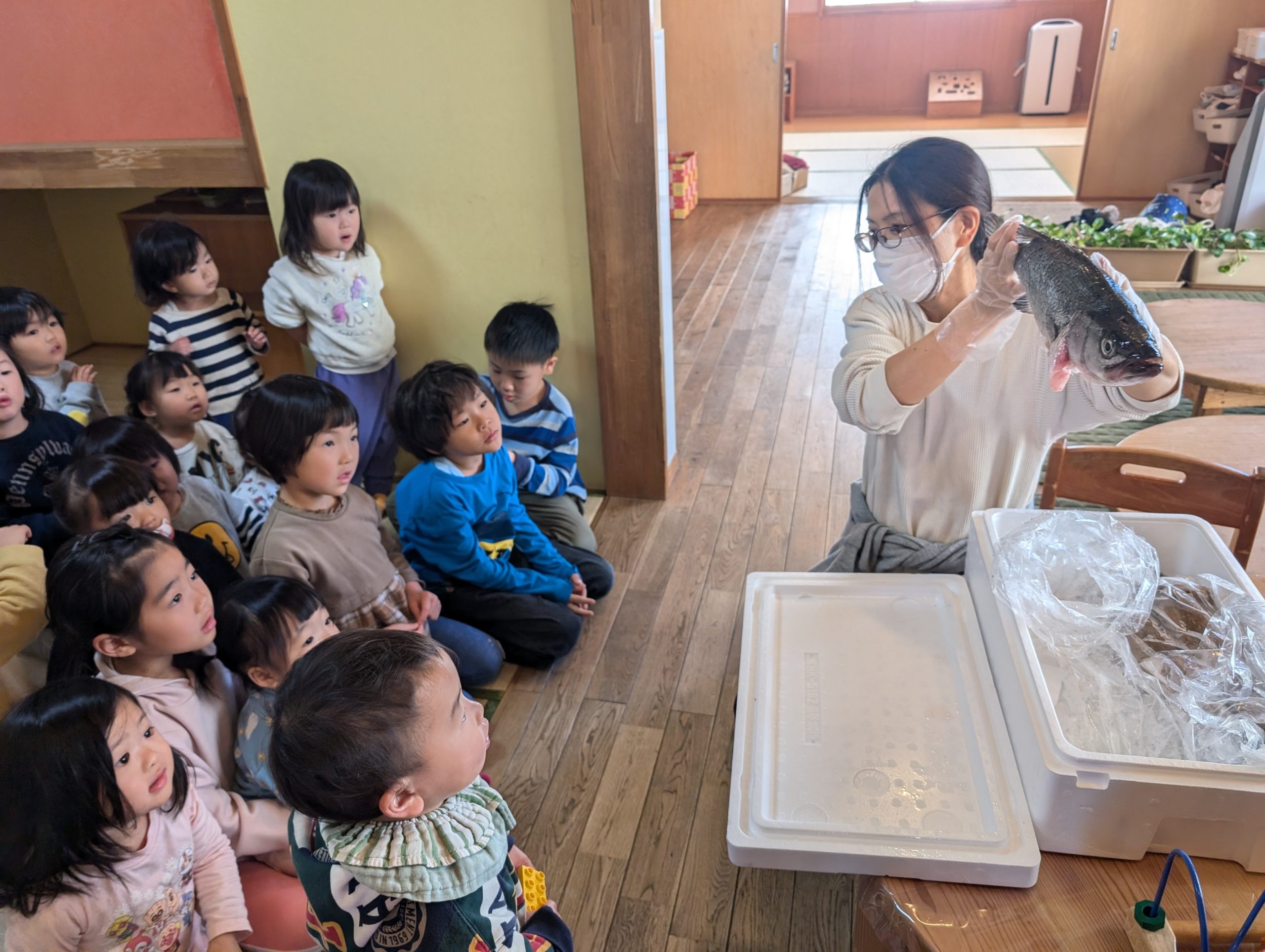 今日はみんなが楽しみにしたいるお魚の日♪今日は『スズキ』『ナメタガレイ』『ヤリイカ』でした♪イカを集いで紹介してもらうと『おお~!!墨がでてきた~!!』と驚いた表情の子ども達!!