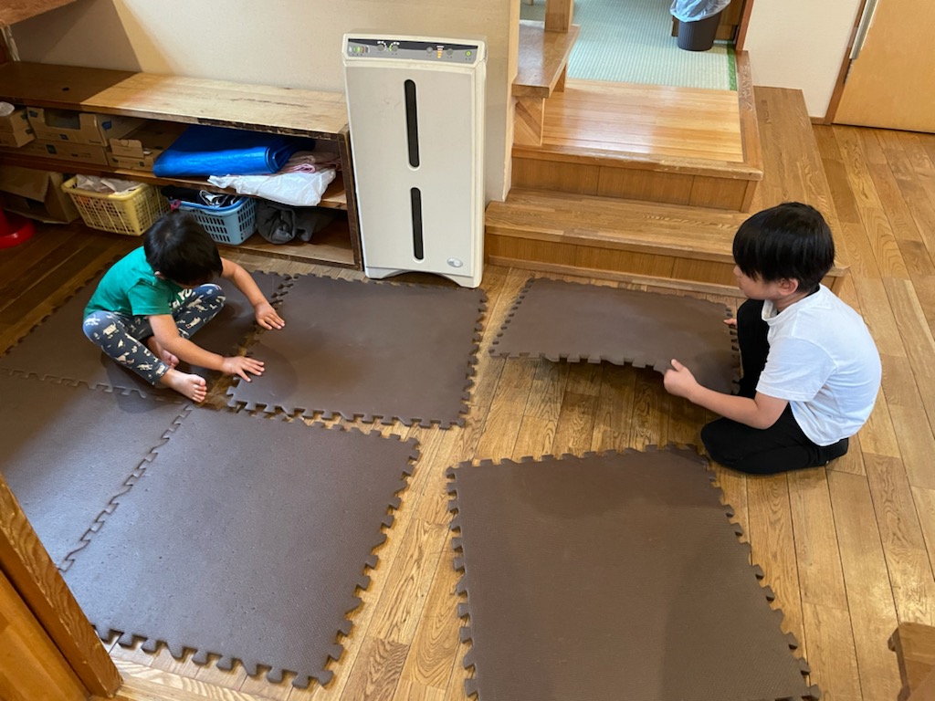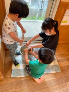 少人数の土曜日。大きいお兄ちゃんお姉ちゃんと一緒にお部屋のお掃除をする3歳児君達。床の雑巾がけをしたり遊び場を整えたりしました。まだお掃除修行中の3歳児君達に手こずりながらも、お兄ちゃんお姉ちゃんがお掃除の仕方を優しく教えてくれていました。全部が終わると〝ふ~っ〟と一息つく大きい子達でした😉「こうやって絞るんだよ」と見せています 何だか嬉しそうにお掃除していました