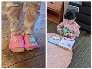 そして・・・アトリエ室で折り紙で作った〝スリッパ〟を履いて遊んだり、空き箱で作った〝赤ちゃん〟に本を読んであげたり・・・