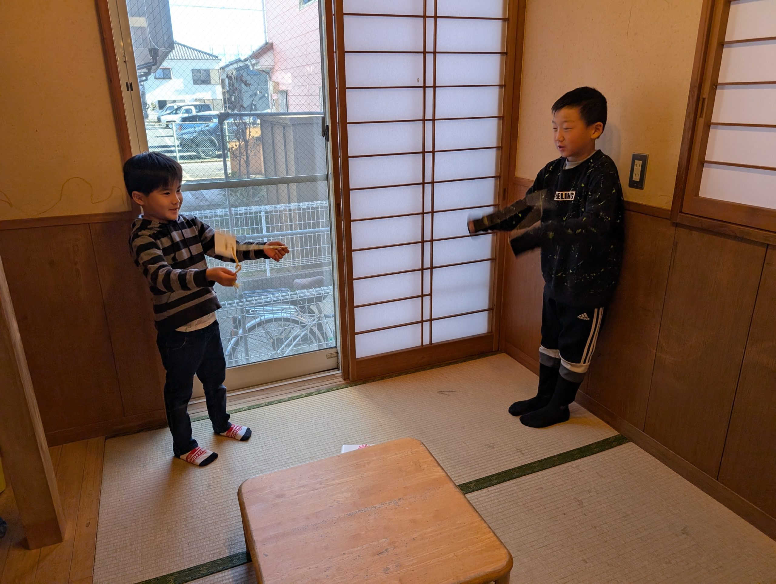 大きい子部屋ではブンブンごまを作って楽しんでいた男の子達!!なかなかうまく回らずに練習中です・・・