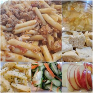 ☆ペンネのボロネーゼ☆キャベツとコーンのスープ☆手作りパン☆ポパイサラダ☆のり塩ポテト☆りんご